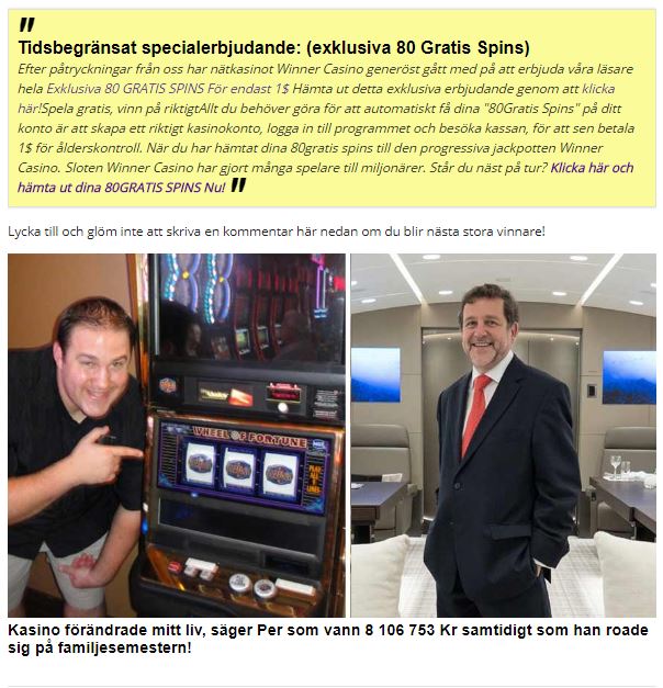 Det beror på att onlinekasino-sidor verkligen betalar ut miljontals dollar och nu är det riskfritt, eftersom de numer regleras av den svenska regeringen. Om du vill öka dina chanser att bli nästa online-miljonär, bör du se till att du följa våra grymma och gratis vinnartips som kasinos definitivt INTE vill att du ska veta!